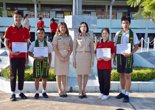 กิจกรรมหน้าเสาธง ท่านผู้อำนวยการโรงเรียน ยกย่องชมเชย มอบเกียรติบัตร สายสะพาย ให้กับนักเรียนที่ได้รับรางวัล การประกวด Youth of the Future Thailand 2019 : Prachuap Kirikhan และมอบเกียรติบัตร ให้กับ คณะกรรมการสภานักเรียน ปีการศึกษา 2561