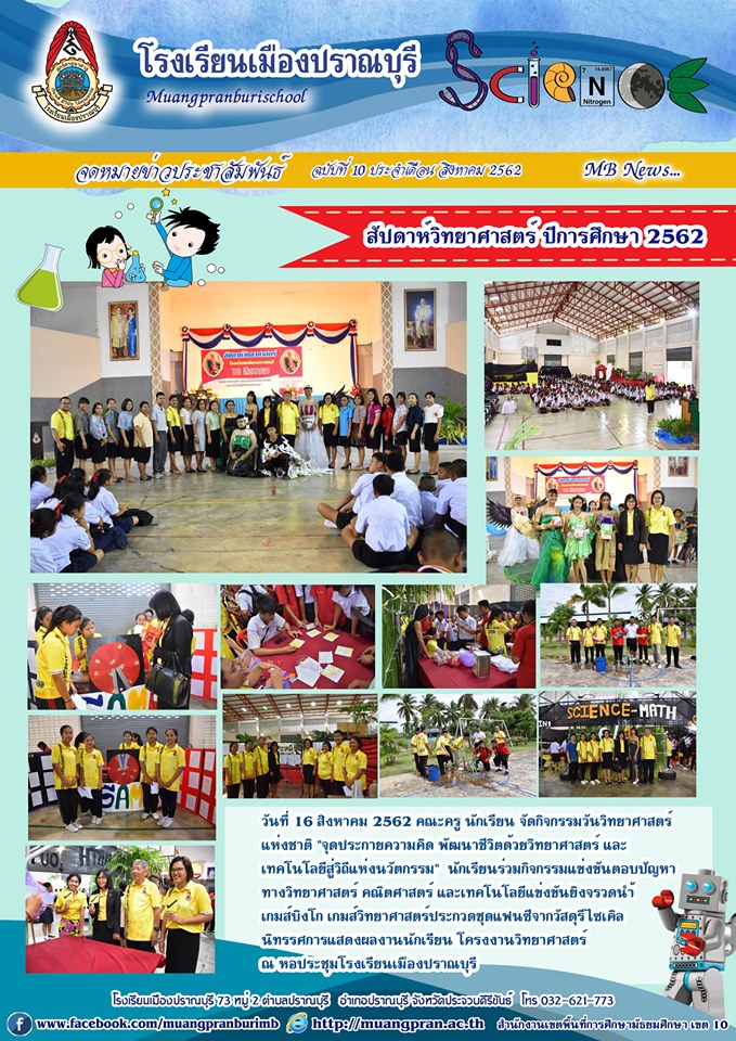คณะครู นักเรียน จัดกิจกรรมวันวิทยาศาสตร์แห่งชาติ "จุดประกายความคิด พัฒนาชีวิตด้วยวิทยาศาสตร์ และเทคโนโลยีสู่วิถีแห่งนวัตกรรม" นักเรียนร่วมกิจกรรมแข่งขันตอบปัญหาทางวิทยาศาสตร์ คณิตศาสตร์ และเทคโนโลยีแข่งขันยิงจรวดนำ้ เกมส์บิงโก เกมส์วิทยาศาสตร์ประกวดชุดแฟนซีจากวัสดุรีไซเคิล นิทรรศการแสดงผลงานนักเรียน โครงงานวิทยาศาสตร์ ณ หอประชุมโรงเรียนเมืองปราณบุรี