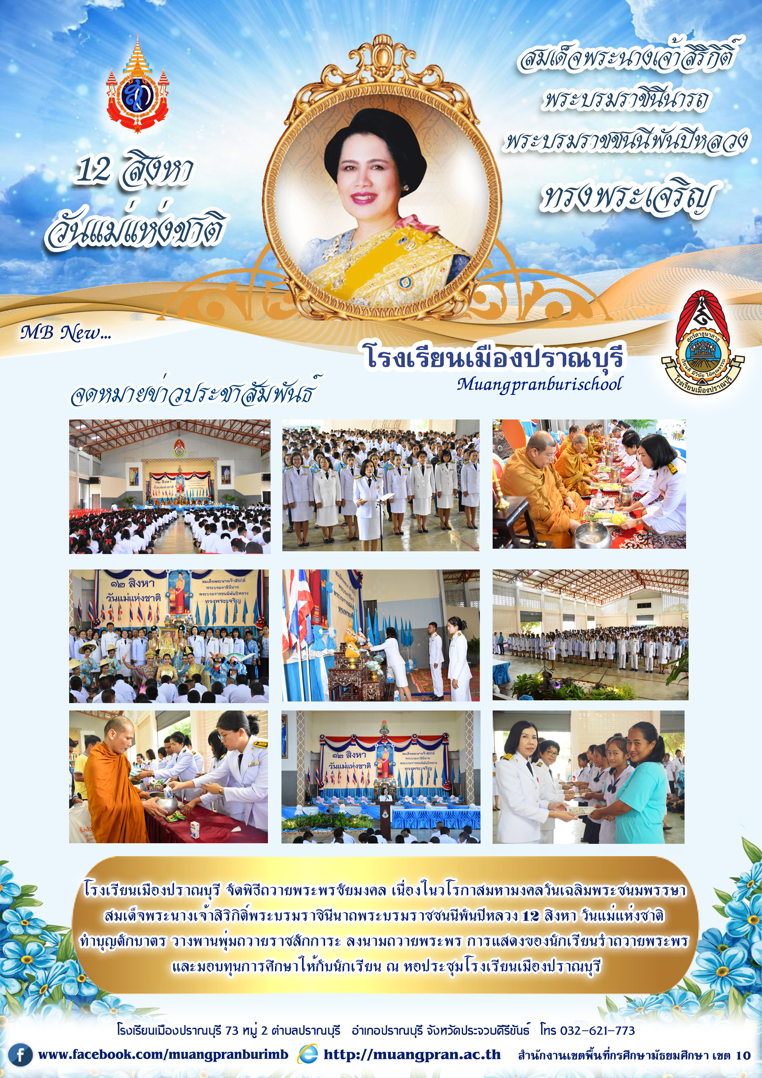 โรงเรียนเมืองปราณบุรี จัดพิธีถวายพระพรชัยมงคล เนื่องในวโรกาสมหามงคลวันเฉลิมพระชนมพรรษา สมเด็จพระนางเจ้าสิริกิติ์พระบรมราชินีนาถพระบรมราชชนนีพันปีหลวง 12 สิงหา วันแม่แห่งชาติ ทำบุญตักบาตร วางพานพุ่มถวายราชสักการะ ลงนามถวายพระพร การแสดงของนักเรียนรำถวายพระพร และมอบทุนการศึกษาให้กับนักเรียน ณ หอประชุมโรงเรียนเมืองปราณบุรี