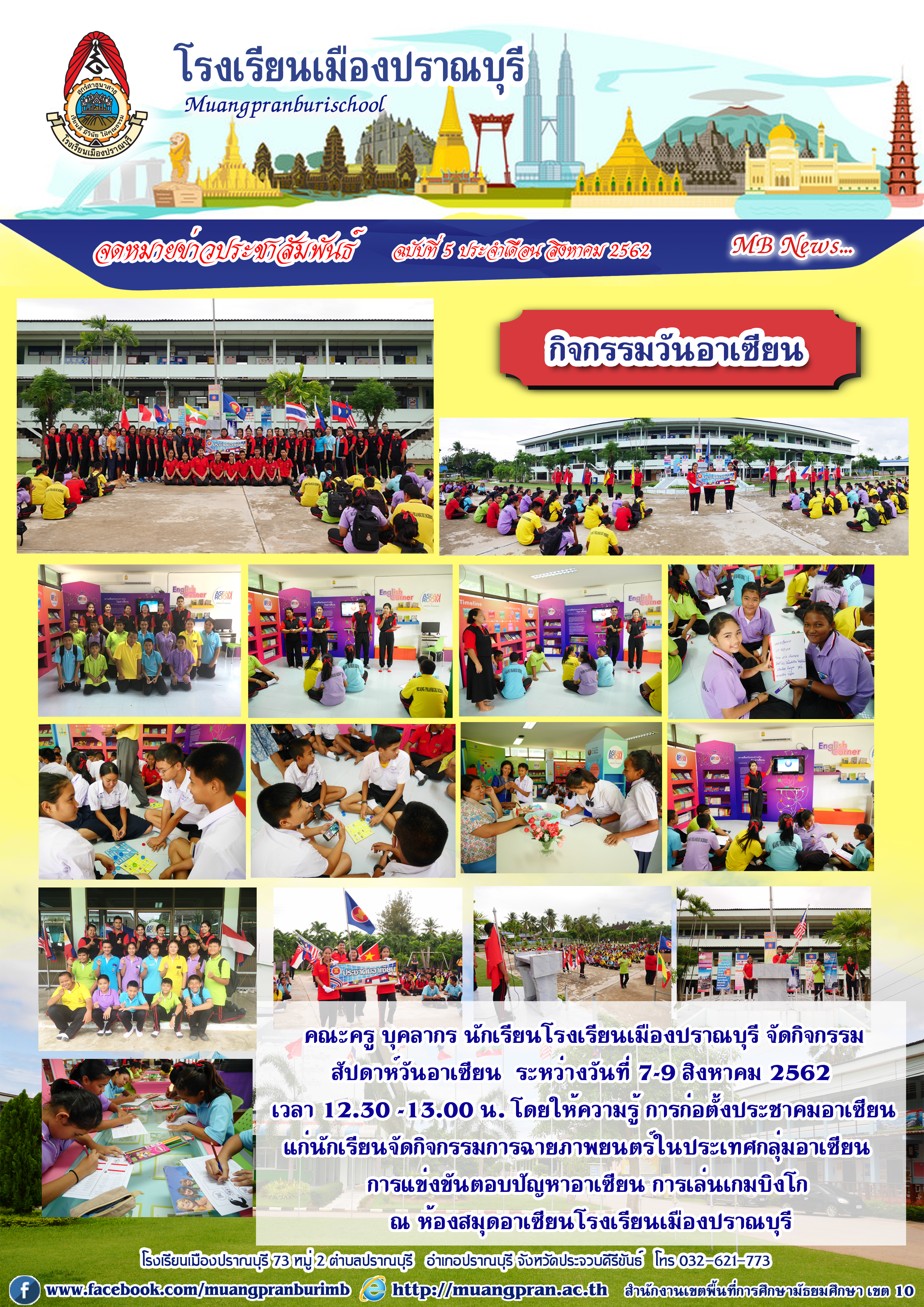 คณะครู บุคลากร นักเรียนโรงเรียนเมืองปราณบุรี จัดกิจกรรม สัปดาห์วันอาเซียน ระหว่างวันที่ 7-9 สิงหาคม 2562 เวลา 12.30 -13.00 น. โดยให้ความรู้ การก่อตั้งประชาคมอาเซียน แก่นักเรียนจัดกิจกรรมการฉายภาพยนตร์ในประเทศกลุ่มอาเซียน การแข่งขันตอบปัญหาอาเซียน การเล่นเกมบิงโก ณ ห้องสมุดอาเซียนโรงเรียนเมืองปราณบุรี.