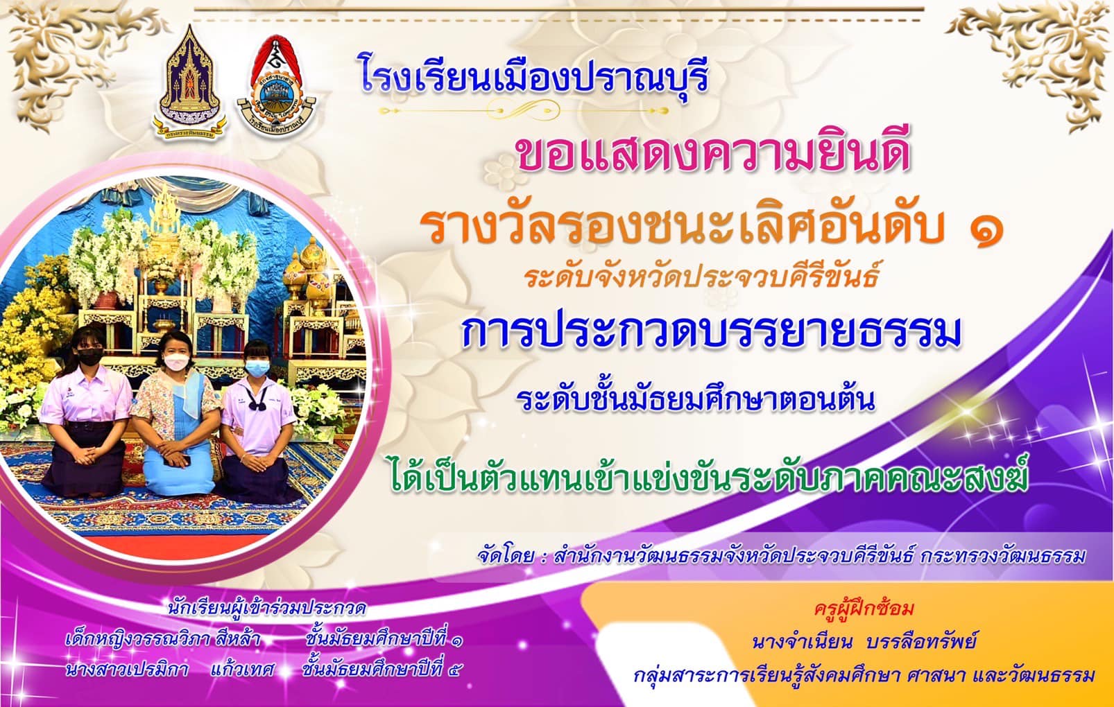 โรงเรียนเมืองปราณบุรีขอแสดงความยินดีกับ เด็กหญิงวรรณวิภา สีหล้า นักเรียนชั้นมัธยมศึกษาปีที่ 1 ได้รับรางวัลรองชนะเลิศอันดับ 1 การประกวดบรรยายธรรม ระดับช่วงชั้นที่ 3 มัธยมศึกษาตอนต้น ประจำปี 2565