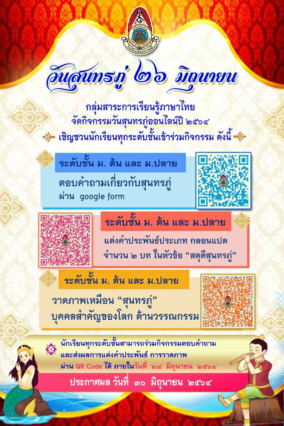 ประชาสัมพันธ์จากกลุ่มสาระการเรียนรู้ภาษาไทย โรงเรียนเมืองปราณบุรี ขอเชิญชวนนักเรียนทุกระดับชั้นเข้าร่วมกิจกรรม วันสุนทรภู่ 26 มิถุนายน