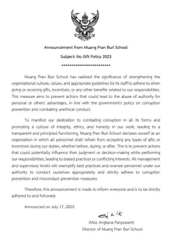 :: ประกาศ นโยบายไม่รับของขวัญและของกำนัลทุกชนิดอัพเดตล่าสุดเมือ: 06 สิงหาคม 2566 | เผยแพร่เมื่อ: 06 สิงหาคม 2566 | เขียนโดย kroonoh | จำนวนผู้เข้าชม : 1114